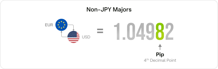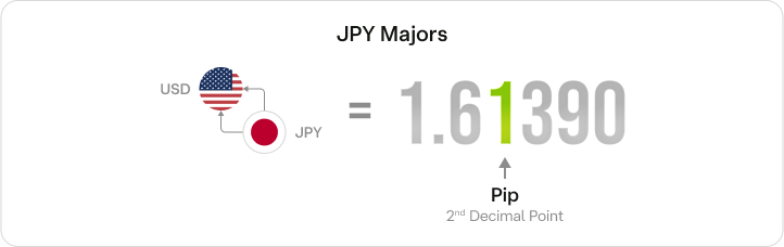 For the non-JPY majors, a pip is the fourth decimal point, representing 1 pip, while for JPY pairs, 1 pip is the second decimal point.