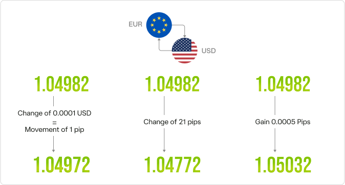 So, if the EUR/USD = 1.04982, a change of 0.0001 USD on either side will represent a movement of 1 pip; if the value of the exact pair changes to 1.04772, then there is a movement change of 21 pips. Similarly, if the EUR/USD value changes to 1.05032, the pair gains 0.0005 pips.