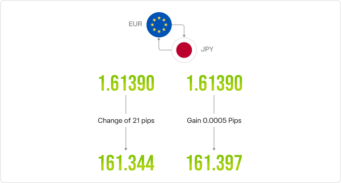 Taking the example of a JPY-based pair, let’s say EUR/JPY is trading at 161.390. If the pair’s value changes to 161.344, it is a 25 pips change. Similarly, if the value of EUR/JPY touches 161.397, then there is a change of 7 pips.