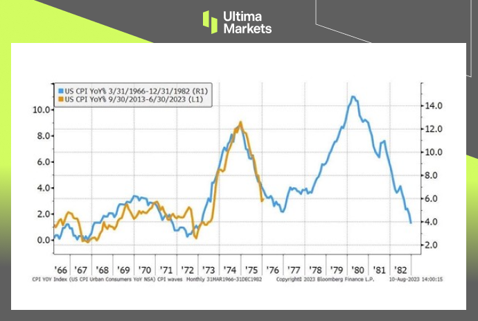 (1966-1982蓝线VS 2013-2023黄线US CPI YoY%)
