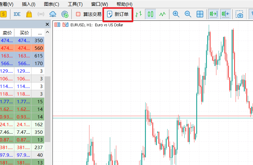 在MT5平台中,交易者既可以查看图表,也可以直接在图表界面完成下单操作。以EURUSD为例,您可以通过菜单栏选择“建立新图表”,在品种列表中找到EURUSD,左键点击即可打开其行情图表,开始进行分析或下单。