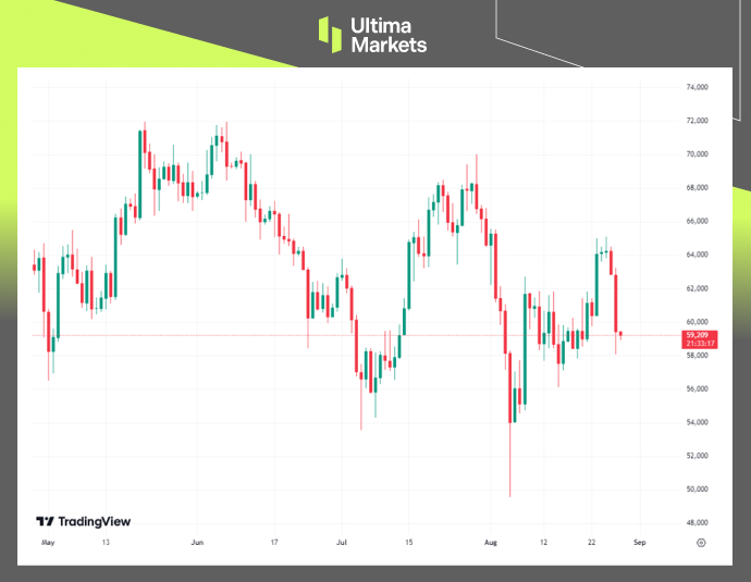 オンチェーン分析アーカム・インテリジェンス(Arkham Intelligence)によると、8月27日、世界最大の仮想通貨取引所であるコインシェアーズ(CoinShares)に、現在の価格で18億8000万ドル相当の3万ビットコインが流入した。このような大規模な流入は、市場参加者の間で懸念を引き起こす傾向があり、売却の意図がある可能性があるため、価格の下落につながる可能性があることを意味する。そのため、当然のことながら、ビットコインは5.45%下落し、59,427ドルで取引を終えた。