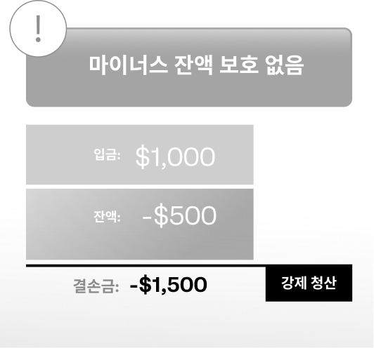 시장 변동성이 큰 시기에는 보유 중인거래 포지션에서 마이너스 잔액이 발생할 수 있습니다.