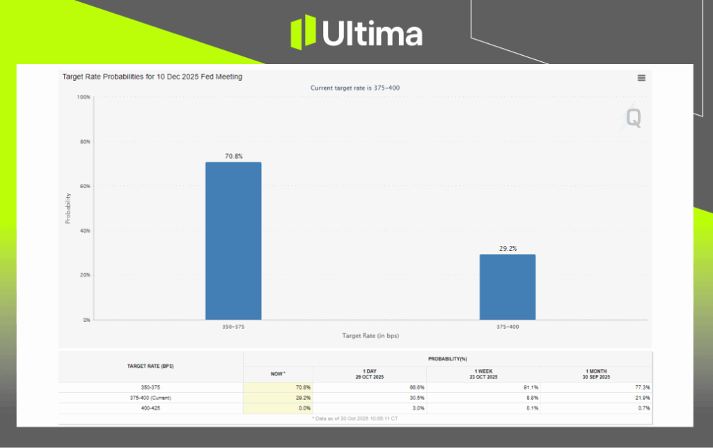 According to the CME FedWatch Tool, the probability of a December rate cut to 3.50%–3.75% has fallen sharply from 91.1% prior to the October meeting to 70.8%.