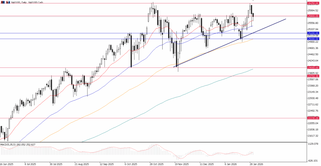 Technically, after pulling back from near-record highs, the next major support falls near 25,800. If the Nasdaq 100 fails to stabilize at this level, it could trigger another sell-off day, putting the index into a broad consolidation (with key support lying at 25,000).