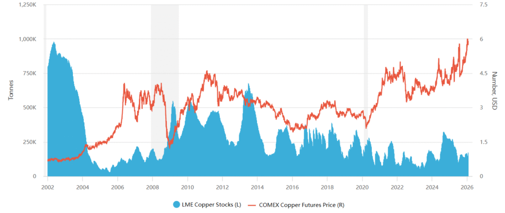 供需基本面是驅動銅價的核心中樞。結合LME與COMEX最新庫存數據來看,全球精煉銅庫存正處於歷史低位,供應偏緊的格局日益凸顯。截至2026年1月23日,LME銅庫存約在171,700噸左右。
