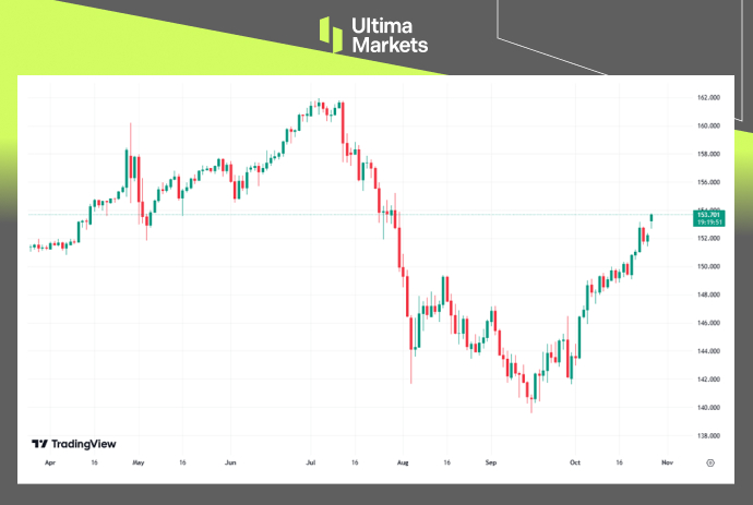 由于日本執政聯盟失去議會多數席位,日元在周一跌至三個月低點,投資者預計未來加息步伐將放緩。同時,隨著美國收益率上升,美元接近月度上漲,日元在早盤交易中觸及自7月底以來的最低點153.3。